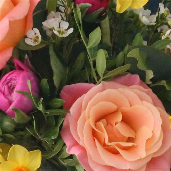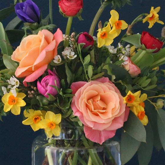 A beautiful selection of spring flowers in a glass vase - content may vary due to availability