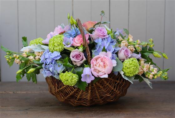 A combination of Blues, Soft Pinks and Mauves with seasonal foliages in a vintage basket.