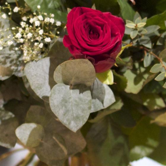 A dozen velvety red long stemmed roses are combined with gypsophila, eucalyptus and salal leaves to create this classic bouquet.