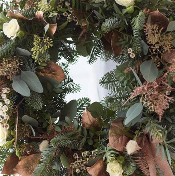 A gorgeous wintery wreath, handcrafted by a local florist. A winter woodland. Blooms in shades of soft snowy shades. Whites, creams, and coppers.
