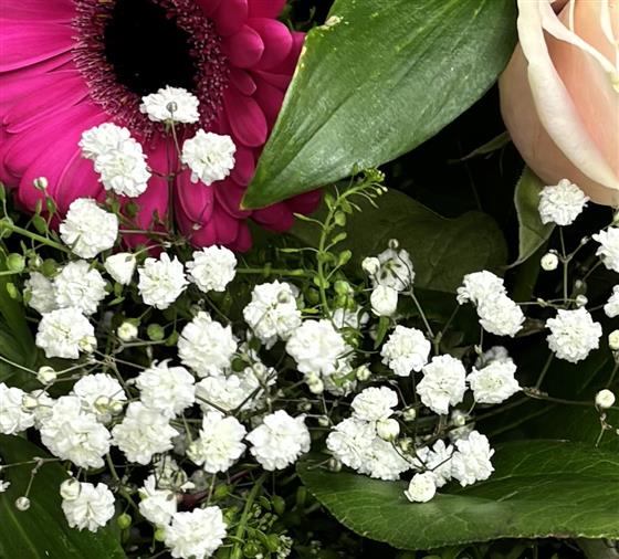 Pink Roses, Alstroemeria, Germini, Gypsophila and Foliages, beautifully tied, wrapped and delivered in water.