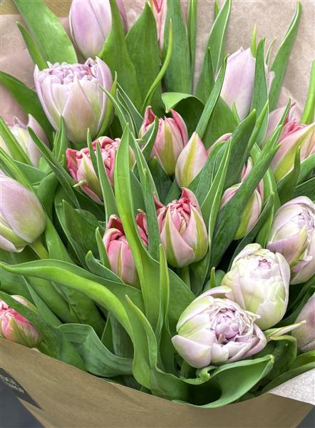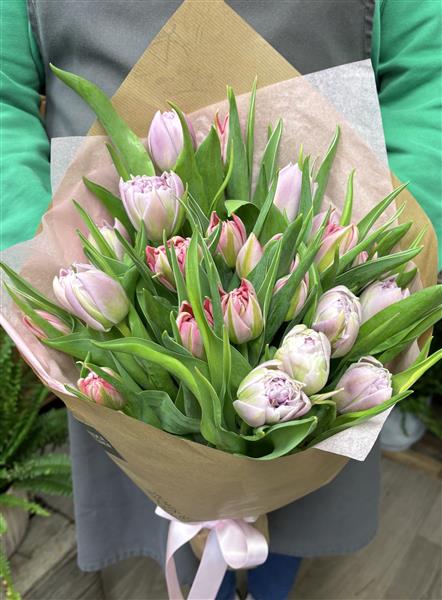 Beautiful tulips simply wrapped in our Kraft paper tied with a satin ribbon. Colours may vary.