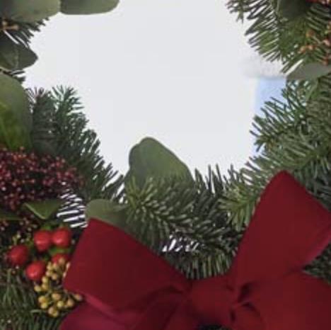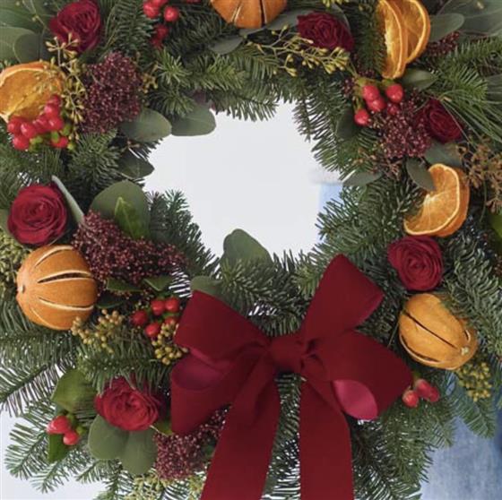 A classic Christmas wreath of fresh foliage and dried fruits, expertly arranged by a local florist.