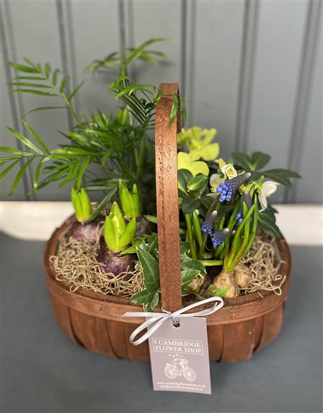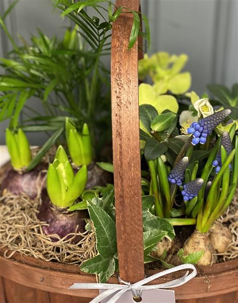 A planted basket with seasonal plants and some spring bulbs.