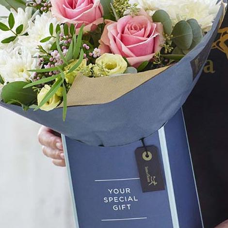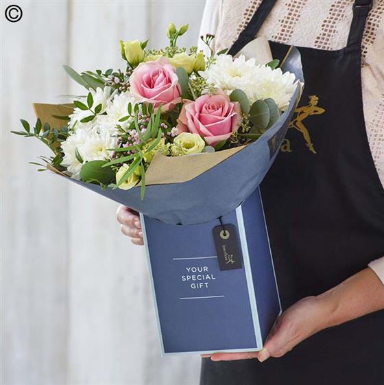 Hand-tied flowers expertly arranged presented in a pretty gift box. Muted tones.