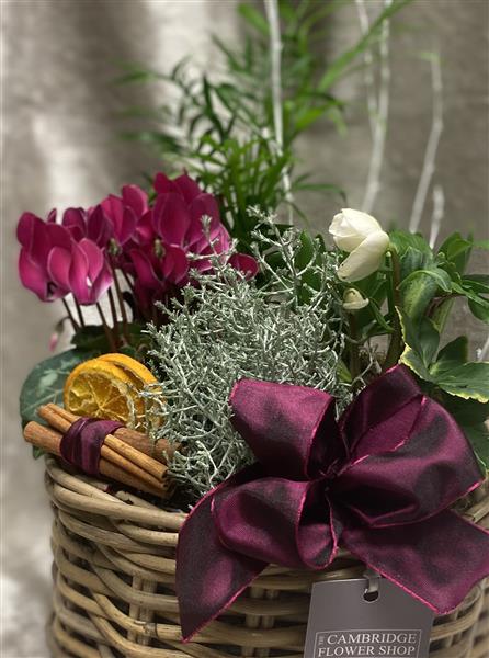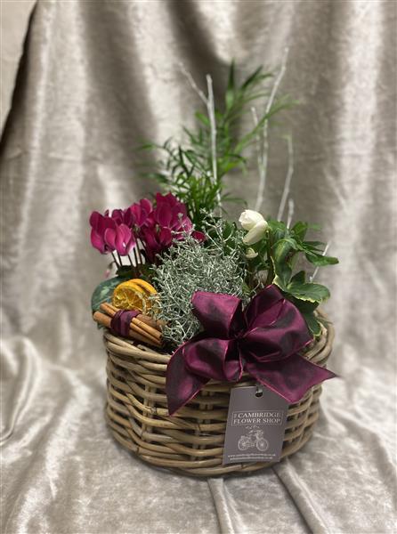 Seasonal Planted Basket with Cyclamen, Helebore, Palm, Hyacinths and Calcepholus. Substitutions may have to be made on availability. .