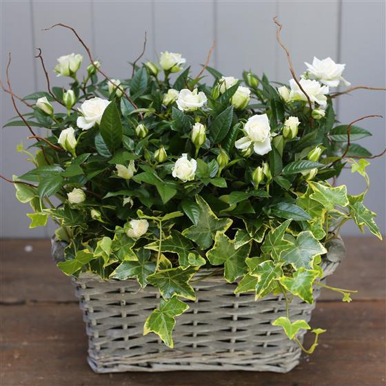 This basket is filled with rose plants and complimenting variegated ivy. Please note rose plant colour will vary, depending on what is best available at the time.